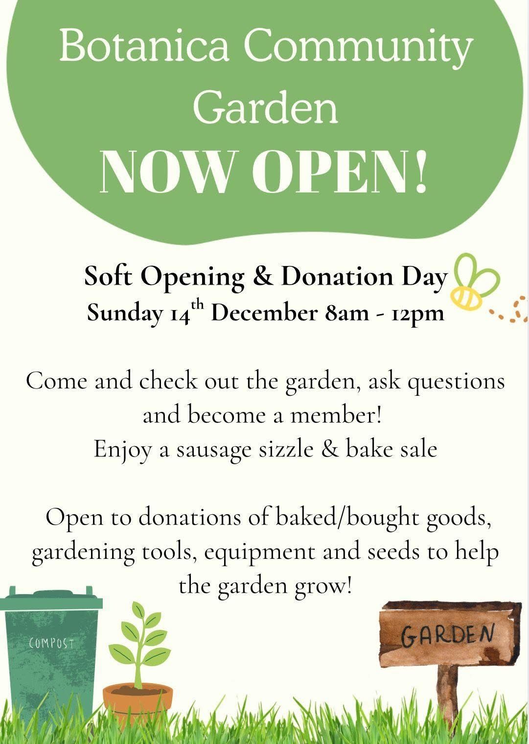 Botanica Garden is opening its gates to the community next Sunday for a sausage sizzle and bake sale. Come down and meet the rest of the community, learn about the garden and how to become a member.